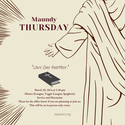 28th @ 5:30 pm Maundy Thursday Dinner and Service